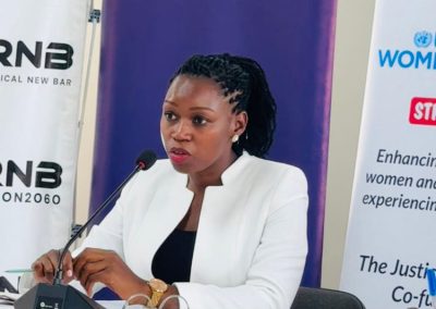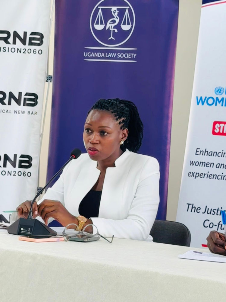 Making a presentation at the Uganda Law Society during the RNB live on the role of Civil Society Organizations in the fight against gender based violence. Bruna delivers a presentation on the role of Civil Society Organizations in ending online violence against women and girls during the commemoration of the 16 Days of Activism Against Gender-Based Violence at the Uganda Law Society.