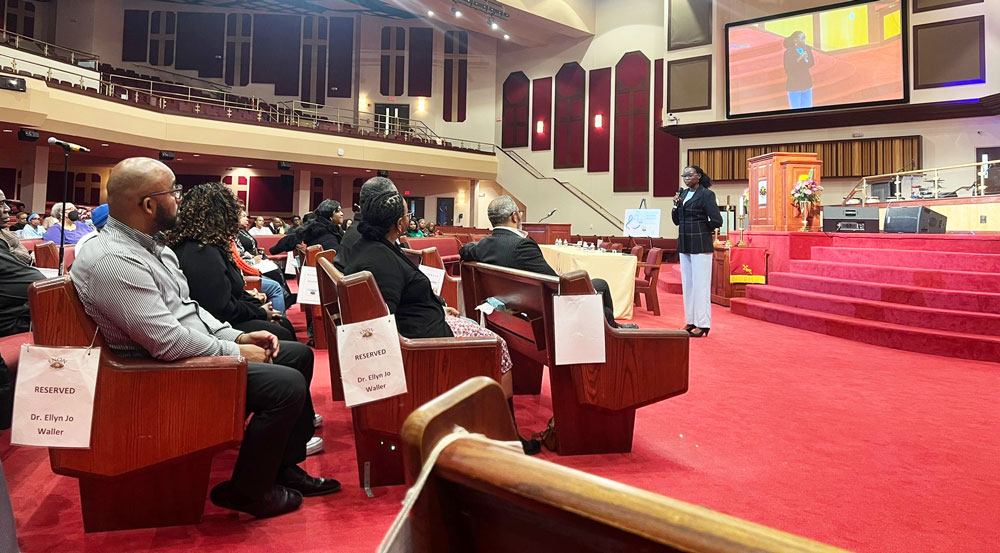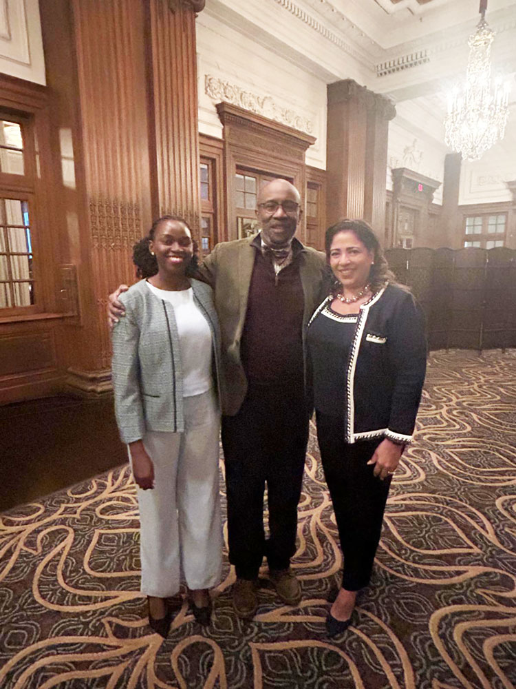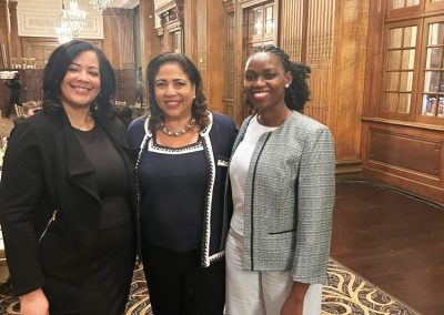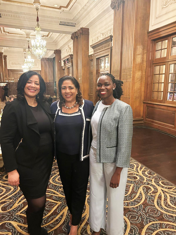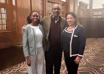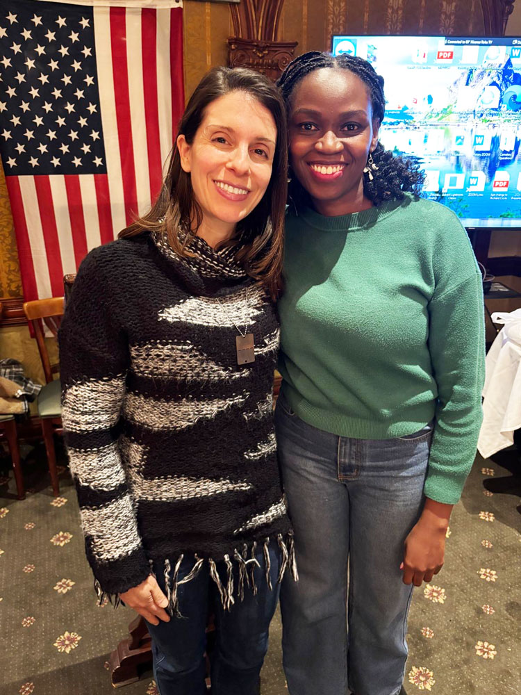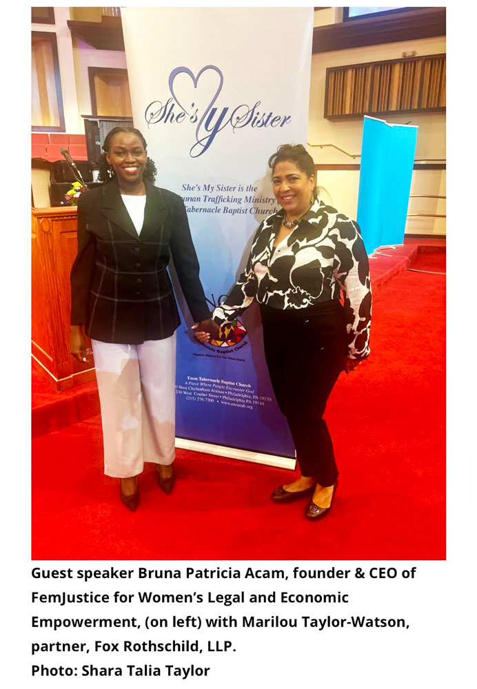 FEMJUSTICE Director Bruna engages with stakeholders in Philadelphia, USA, during a series of strategic advocacy and learning events. Pictured (left to right, across events): Dr. Dara Lovitz and Bruna following Bruna’s address at the Lower Merion Rotary Club; Bruna with Judge Charles Hayden, Marilou Taylor and Crystal at the Dr. Martin Luther King Jr. Annual Memorial Breakfast; Jasmine Martin, Dr. Ellyn Jo Waller and Bruna at the Annual Human Trafficking Awareness Conference; and Bruna with Ahaji, Parfait, Jaara and Marilou at Drexel University, Philadelphia.