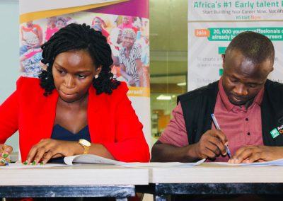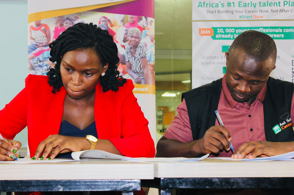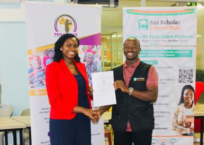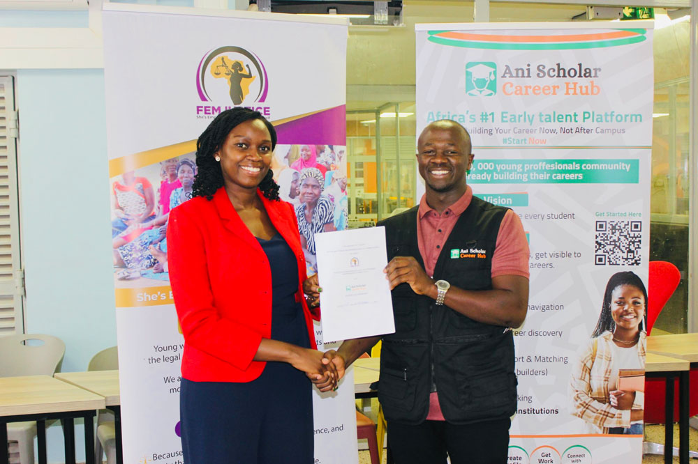 FEMJUSTICE Director Bruna and AniScholar Director Joseph Luswabi formalize a partnership through the signing of an MOU to advance university student skilling under the Career Readiness and Employability Program.
